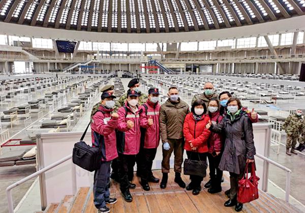 塞尔维亚国防部长武林(中)和专家组参观方舱医院床位设置