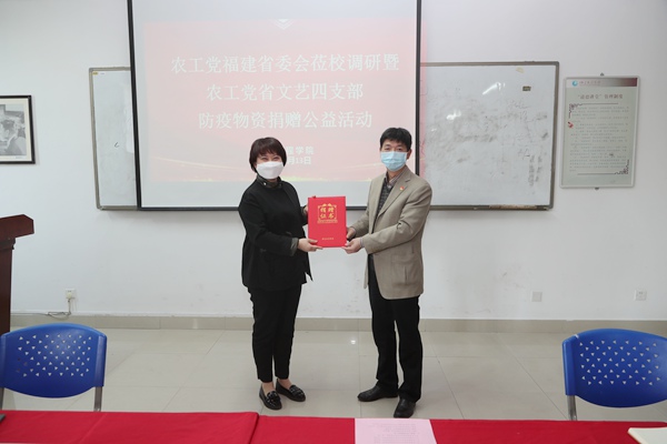疫情期间,农工党福建省文艺四支部全体党员响应农工党福建省委会号召,筹集口罩1000个,84消毒液10件等防疫物资,向福建工程学院捐赠。捐赠仪式上,詹松青代表福建工程学院向农工党福建省文艺四支部颁发了捐赠证书。