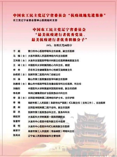 为表彰先进、树立典型,进一步激励全省各级组织和广大农工党党员勇于担当作为,经农工党辽宁省委会研究决定,授予农工党辽宁省委会雷神山医院临时支部“抗疫战地先进集体”光荣称号;授予邵忠等18名党员“最美抗疫逆行者优秀党员”、授予张肖冰为“最美抗疫逆行者优秀积极分子”光荣称号
