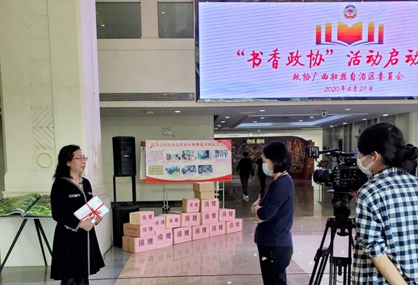 2020年4月27日,广西自治区政协举行“书香政协”活动启动仪式,自治区政协主席蓝天立出席启动仪式并向参加活动的政协委员代表赠送自治区党委书记、自治区人大常委会主任鹿心社向全区读者朋友们推荐的三本书——《平语近人·习近平总书记用典》《百年大变局·世界与中国》《红色家书》。自治区政协常委、农工党广西区委会副主委何敏代表区委会参加启动仪式并喜获赠书。