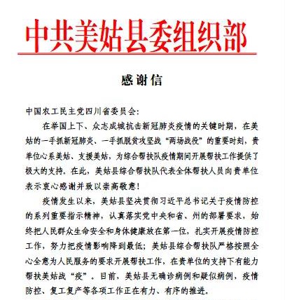 2020年5月6日,农工党四川省委会收到一封来自美姑县综合帮扶工作队(中共美姑县委组织部代章)的感谢信,对省委会在疫情期间为工作队开展相关帮扶工作提供支持表示感谢。