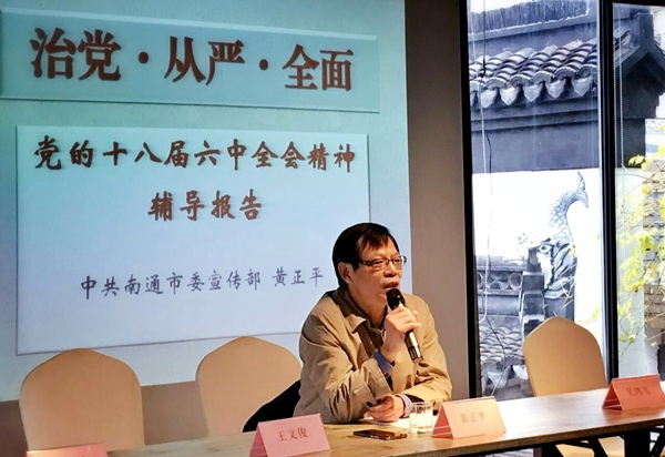黄振平给参与学习活动的党员做了精彩的辅导报告《治党.从严.全面》,他全面系统地介绍了习近平总书记在中共十八届六中全会上的重要讲话精神、《关于新形势下党内政治生活的若干准则》的基本精神和《中国共产党党内监督条例》。农工党南通市委会驻会副主委吴鸿飞介绍了中国农工民主党南通市第十次代表大会的主要议程、工作报告以及大会通过的各项决议。