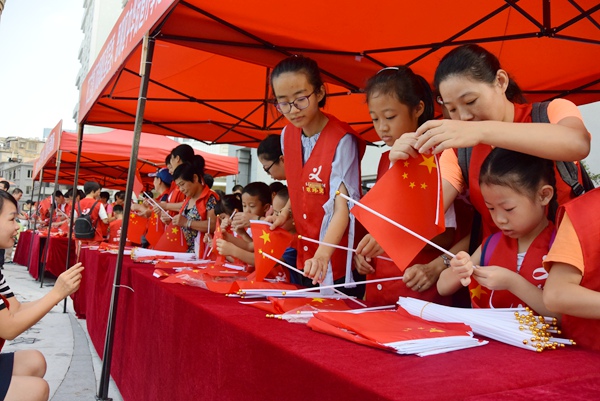 2017年10月1日上午,农工党厦门市思明区基层委、中共厦门中华街道党工委、中华街道办在中山路联合举办“喜迎十九大 不忘合作初心 让国旗永远飘扬”国旗免费发放活动。思明区基层委主委王萍以及来自思明区基层委各个支部的近百位农工党员到现场担任发放国旗的志愿者,不少党员把孩子也带到了现场参加活动,感受爱国情怀。