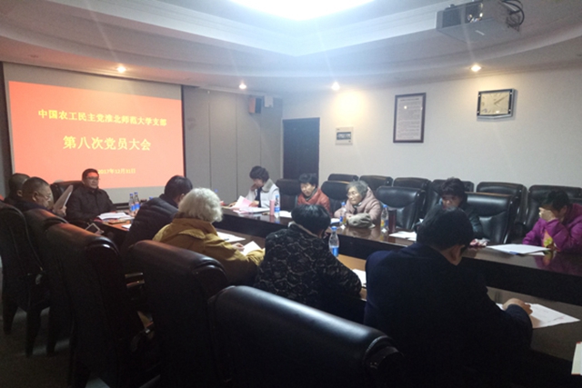 2017年12月31日下午,农工党淮北师范大学支部在淮北师范大学行政楼第一会议室举行了农工党淮北师范大学支部委员会第八次党员大会,出席大会的有中共淮北师范大学党委统战部部长王向阳,农工党淮北市委会主委冯志强,副主委刘永刚、丁言荣、黄虹,组织部部长王云,以及农工党淮北师范大学支部的各位党员。任强主持会议。