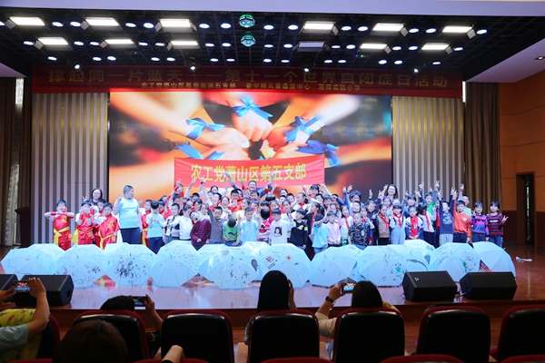 活动现场,20余名自闭症儿童表演歌伴舞节目《感恩的心》,并与五支部党员和湘师实验学校的近百名学生开展游戏联欢活动,共同绘制20把象征着关爱、包容、友谊和健康的蓝伞。蓝伞将由第五支部党员公益认购,所得善款将全部用于资助参与今天活动的自闭症儿童。