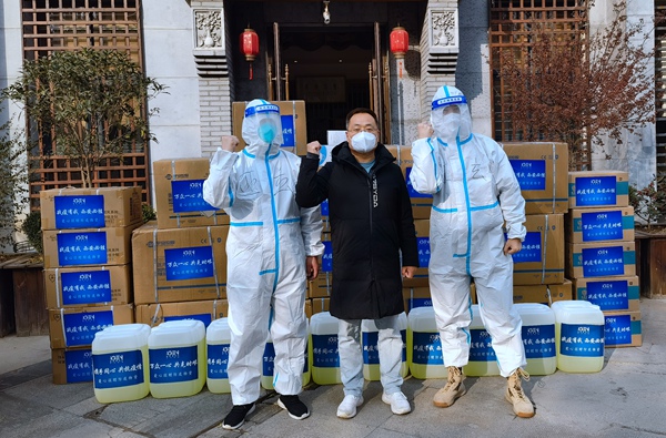 农工党党员陈浩(中)为社区捐赠防疫物资