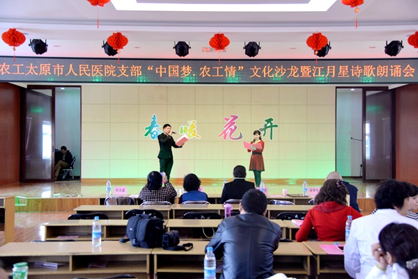 2015年4月10日下午,农工党太原市人民医院支部“中国梦.农工情”文化沙龙暨“春暖花开”江月星诗歌朗诵会在太原市人民医院举办。太原市政协副主席、农工党太原市委会主委王爱萍,太原市诗词协会副会长孙爱晶、太原市人民医院党委书记郭江泽观看了朗诵会。