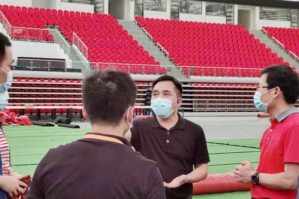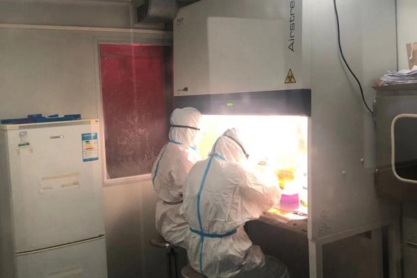 广州市委会法律基层委员会委员,广州金域医学集团首席运营官、副总裁谢江涛(右二)在广州体育馆气膜方舱实验室指导建设工作。