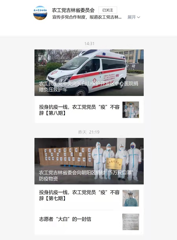 自疫情爆发以来,农工党吉林省委会及地方各级组织坚守宣传阵地,充分利用新媒体传播平台,通过网站、公众号、微信等及时宣传各级组织和广大党员防疫抗疫感人事迹和先进典型,着力发现、挖掘抗疫一线的优秀党员医护人员和志愿者,讲好抗疫好故事,提振信心,汇聚正能量,展现吉林省农工党团结一心、共同抗疫的精神面貌。截至目前,农工党吉林省委会发布“投身一线,农工党党员‘疫’不容辞”抗疫专题9期,累计发布抗疫报道41篇。