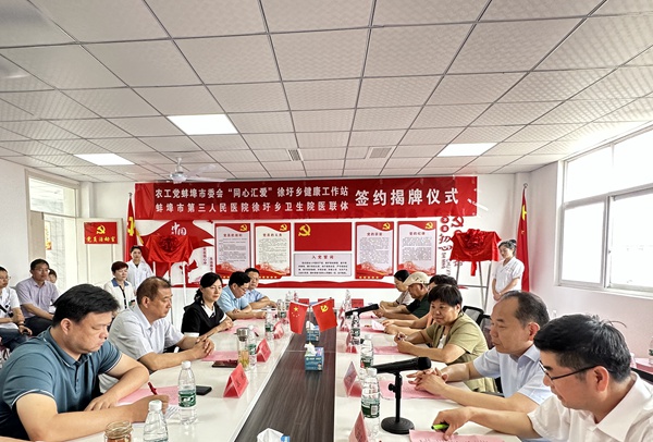 2023年6月30日,农工党蚌埠市委会“同心汇爱”徐圩乡健康工作站、蚌埠市第三人民医院徐圩乡医联体签约揭牌。安徽省政协副秘书长、农工党安徽省委会专职副主委黄珍,中共蚌埠市委统战部副部长、民宗局局长柴启明,农工党蚌埠市委会主委陈春霞,蚌埠市第三人民医院党委委员叶纯影,中共怀远县委常委、统战部部长王奎,怀远县政府副县长王岂出席活动。仪式由徐圩乡党委书记耿文杰主持。