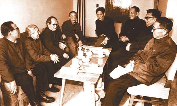 1980年12月,时任省委会副主委黄桐华(右一)参加农工党中央召开的全国工作会议,期间与农工党中央沈其震(左三)、方荣欣(左四)等领导座谈