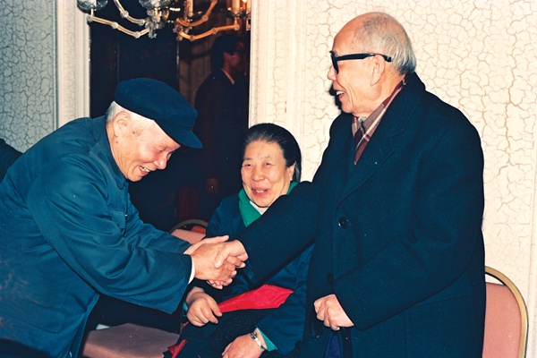 1988年2月11日,时任农工党中央主席周谷城(右一)在广州亲切会见时任农工党广东省委会主委魏鉴贤