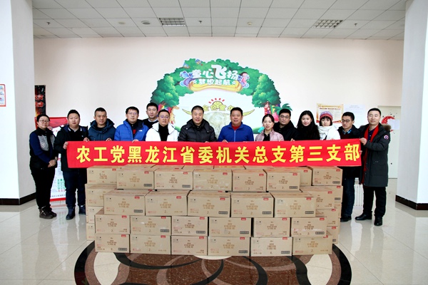 2019年1月3日上午,农工党黑龙江省委会机关总支第三支部联合贝因美婴童食品股份公司向赴哈尔滨市儿童福利院开展爱心捐赠活动。农工党黑龙江省委会驻会副主委刘长青、哈尔滨市儿童福利院常务副院长王绍龙、农工党黑龙江省委会副秘书长兼组织部部长贺丽琪、农工党黑龙江省委会机关总支第三支部主委宋春武出席捐赠活动。