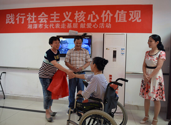 捐赠仪式上,市妇联领导、市疾控中心主任马金辉、中心工会主席王建坤共同揭开空调红丝带,一阵阵凉风随即送遍了整个敬老院的活动大厅。随后马金辉关切慰问了敬老院的情况,同时表示为敬老院捐赠空调是疾控中心的社会责任感体现。湘潭疾控人都对“板凳妈妈”许月华的敬佩之情,为她身上的这种奉献精神所感动。板凳妈妈许月华表示了深深地感谢,空调大大改善了生活环境,解决了最实际的问题,真是雪中送碳,夏季送清凉。 板凳妈妈许月华,59岁,双腿高位截肢,系全国道德模范、全国优秀共产党员,夫妻俩同患肺癌。怀着对党和政府的感恩之情,今年4月,具有40余年福利院服务工作经验的板凳妈妈许月华授任于吉安路社区养老中心,以公建民营的方式办起了“湘潭市板凳妈妈敬老院”,准备打造成为敬老院的标杆,在社会上造成很大的影响,中心这次活动正是受到板凳妈妈精神的感召。