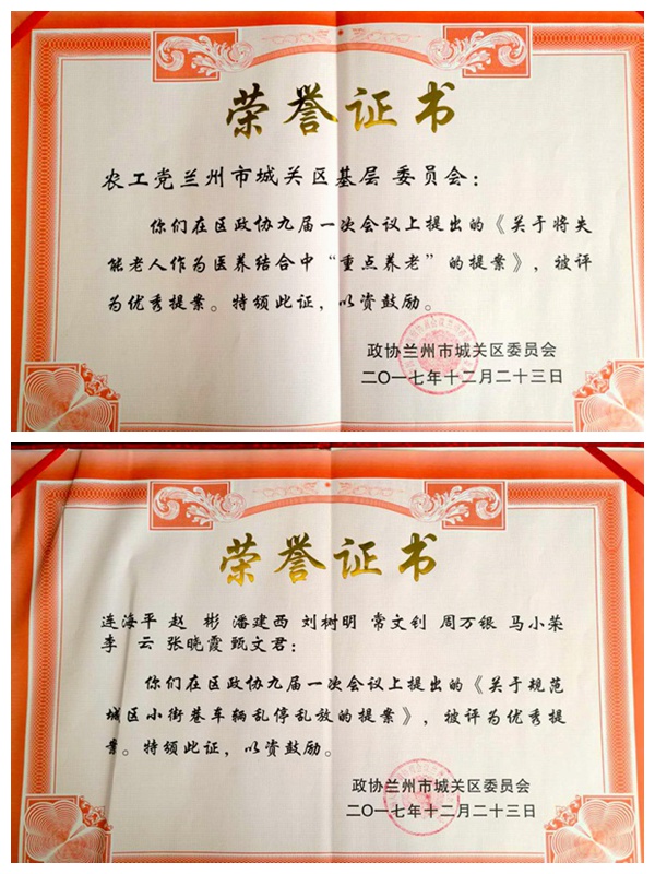 区政协九届二次会议还对一次会议以来的优秀提案和优秀政协委员进行了表彰,基层委提交的《关于将失能老人作为“医养结合”中重点养老的提案》被评为优秀集体提案,《关于规范城区小街巷车辆乱停乱放的提案》被评为优秀联名提案。(农工党兰州市委会)