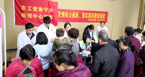 2019年3月8日上午,农工党南宁市疾控中心支部与兴宁区三塘镇卫生院党支部联合组成医疗志愿者服务队,到社区开展免费义诊活动,为社区居民送上健康与服务。