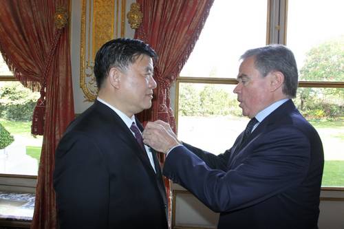 2012年4月12日,法国国民议会议长阿夸耶在巴黎代表法国总统萨科齐授予陈竺“法国荣誉军团军官勋章