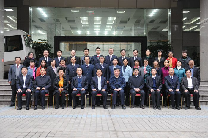 12月12日,出席十五届第五次中央主席会议后,中央主席会成员看望农工党福建省委会机关工作人员座谈合影,并为省委会机关党史长廊展揭幕。(摄影:常云岐)
