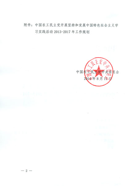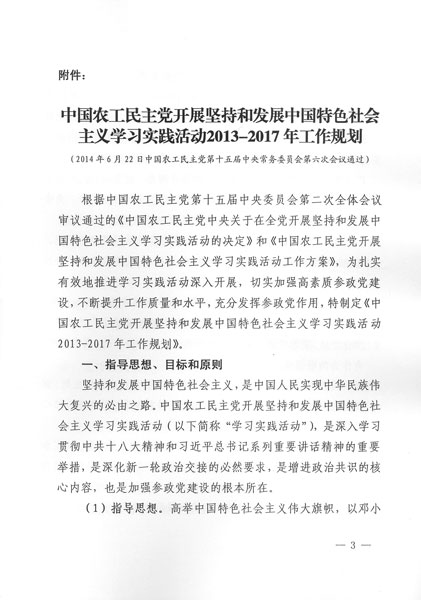 为扎实有效地推进坚持和发展中国特色社会主义学习实践活动在全党深入开展,建设与中国共产党通力合作的、高素质的、有作为的中国特色社会主义参政党,切实承担起中国特色社会主义亲历者、实践者、维护者、捍卫者的政治责任,农工党中央制定了《中国农工民主党开展坚持和发展中国特色社会主义学习实践活动2013-2017年工作规划》(以下简称“《工作规划》”),经2014年