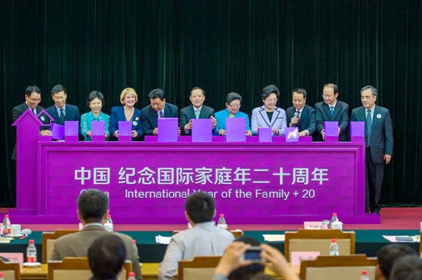 2014年5月15日是国际家庭日。联合国确定今年国际家庭日的主题为:家庭事关发展目标的实现。中国的主题是:人人健康,家家幸福。为做好国际家庭日的主题宣传,在全社会广泛树立家庭发展理念,促进家庭发展工作,2014年5月14日,由国家卫生计生委、全国妇联、共青团中央、全国老龄办、中国关工委联合主办的2014年国际家庭日中国纪念大会在北京召开。全国政协副主席刘晓峰出席会议并讲话,中国关工委主任顾秀莲、中国人口福利基金会会长王忠禹启动“中国家庭儿童安全计划”和“新家庭计划——家庭发展能力建设”项目,国家卫生计生委主任李斌讲话,世界家庭组织主席黛西·库斯特拉为大会致辞。国家卫生计生委副主任王培安主持会议,并发布《中国家庭发展报告》。全国妇联副主席赵东花、共青团中央书记处书记周长奎、全国老龄办副主任朱勇、中国计划生育协会常务副会长杨玉学、中国人口福利基金会理事长赵炳礼出席会议。