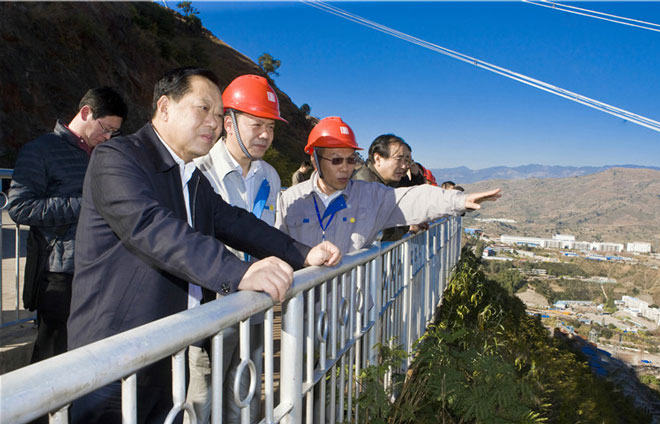 刘晓峰在缆机平台听取了观音岩水电工程建设情况介绍,对观音岩水电站在安全、质量、进度管理上取得的成绩表示满意,并对观音岩水电站不忘社会责任承担攀枝花城市供水等任务表示赞赏。刘晓峰详细了解了项目建设中移民和环境保护的工作情况。他一边听取汇报,一边不断点头,对观音岩水电站在建设过程中的移民和环境保护工作也给予了肯定。他强调,金沙江水能资源是国家的宝贵财富,在开发利用过程中,地方政府要着眼于水电开发可持续发展,坚持科学规划、全盘统筹,充分发挥好金沙江水能资源的综合效益;要深入贯彻落实中共中央关于加强生态文明建设的部署,在实施项目建设的同时,采取有效的防治污染措施与生态环境保护措施,继续做好水体保护、鱼类增殖等生态环境保护工作,使经济建设和生态文明建设齐头并进,相得益彰,推动形成人与自然和谐发展的现代化建设新格局;要把项目建设与推进“三农”工作、综合扶贫开发等工作有机结合,进一步改善当地群众的生产生活条件,拓宽群众增收致富的渠道,实现开发一方资源、带动一方经济、造福一方百姓的目标。