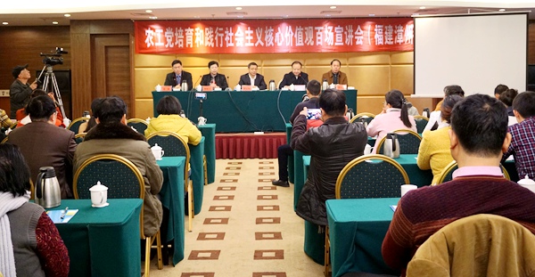 培育和践行社会主义核心价值观是农工党在新的历史条件下,不断增强政治意识、大局意识、核心意识、看齐意识,不断巩固思想政治基础,不断提高政治辨别力,坚定理想信念、始终保持进步性的迫切需要。根据《农工党中央坚持和发展中国特色社会主义学习实践活动规划》的部署,2016年农工党中央以“培育和践行社会主义核心价值观”为主题,开展百场宣讲活动,在全党弘扬正能量、焕发新精神、激发新干劲,切实推动学习实践活动深入开展。2016年3月中旬,百场宣讲活动将在上海农工党一干会址正式启动,农工党各级组织将自主举行主题宣讲活动,使社会主义核心价值观深入人心。
