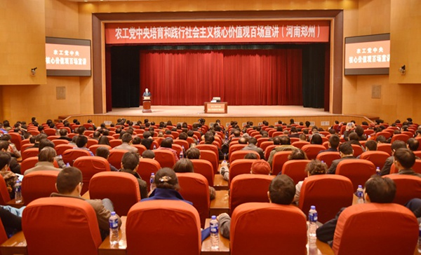 2016年2月20日,农工党中央“培育和践行社会主义核心价值观百场宣讲”走进河南郑州,开展了试点宣讲。河南省政协副主席、农工党中央常委、河南省委会主委高体健出席宣讲会并致辞。农工党中央研究室主任游宏炳、农工党钦州市委会副主委邓秋晓、农工党广东省委会常委秦鉴分别作了“爱国民主——农工党的历史选择与优良传统”、“和谐友善——培育好家风”、“敬业诚信——做一名合格的农工党员”专题宣讲,受到了与会党员的热烈欢迎和好评。