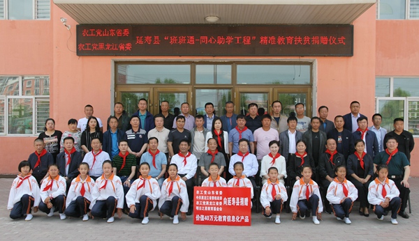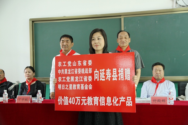 捐赠仪式在延寿县东风小学举行。仪式上,农工党山东省委会、农工党黑龙江省委会、明日之星教育基金会向延寿县1个实验班和27所中小学捐赠价值40万元的平板电脑、学习软件、学习卡等班班通教辅物资。