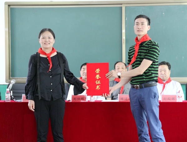 张淑英向捐赠方代表贾怀山颁发荣誉证书。