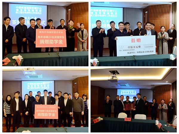 调研组还在大方县举行了中国疾病预防控制中心、独角兽领袖联盟、农工党中央青年工作委员会帮扶大方县签约及捐赠仪式。仪式上,中国疾病预防控制中心与大方县疾病预防控制中心签订了帮扶合作协议,独角兽领袖联盟企业家们向大方县捐赠了教育基金和贫困学生助学金,农工党中央青年工作委员会向大方县羊场镇贫困学生捐赠了助学金。
