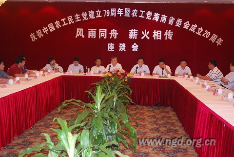 为隆重庆祝这一不平凡的节日,为广泛宣传中国共产党领导的多党合作和政治协商制度下取得的伟大成就。8月8日下午,纪念中国农工民主党建立79周年暨农工党海南省委会成立20周年的“风雨同舟·薪火相传”专题座谈会在海口市召开。农工党海南省委会全体委员、基层组织主委、省人大代表、省政协委员和基层骨干约70余人参加了会议。农工党中央副主席、广东省人大常委会副主任、农工党广东省委会主委王宁生,农工党中央副主席、云南省政协副主席、云南省委会主委陈勋儒,农工党中央副主席、全国政协常委刘晓峰,海南省政协副主席、中共海南省委统战部部长邱德群,海南省政协副主席、农工党海南省委会主委王路,海南省政协副主席、民进海南省委会主委史贻云出席会议。