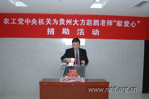 2009年12月15日下午,农工党中央机关二层大厅举行了隆重的捐款仪式,农工党中央机关工作人员积极踊跃地为患病的赵鹏老师捐献爱心款。