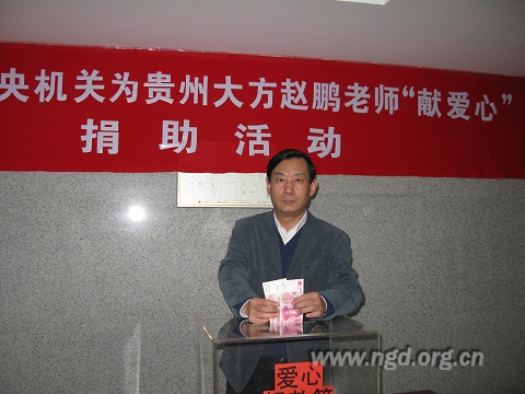 贵州省大方县是农工党中央扶贫联系点,赵鹏老师的境况深深的牵动着农工党中央领导和干部的心,农工党机关工会、农工党支部、中共支部和共青团支部联合发出向赵鹏捐款的的倡议。农工党中央主席桑国卫、常务副主席陈宗兴、副主席汪纪戎、刘晓峰和秘书长带头捐款。一时间,上至主席,下至普通工作人员,农工中央的同志积极响应。农工党中央机关及下属中国初级卫生保健基金会共募集爱心款3万2千余元,希望能够和社会各界捐款一起共同挽救赵鹏年轻的生命。