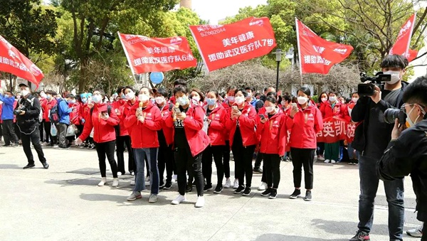 2020年3月24日下午,农工党中央副主席、上海市人大常委会副主任、农工党上海市委会主委蔡威,农工党上海市委会专职副主委陈芳源、秘书长王晓东与上海农工党党员、美年健康董事长俞熔,前往上海虹桥机场附近的锦江酒店,迎接看望圆满完成驰援武汉任务、刚刚抵沪的农工党党员、美年健康副董事长、援鄂医疗队领队郭美玲和美年健康援鄂医疗队的全体队员。