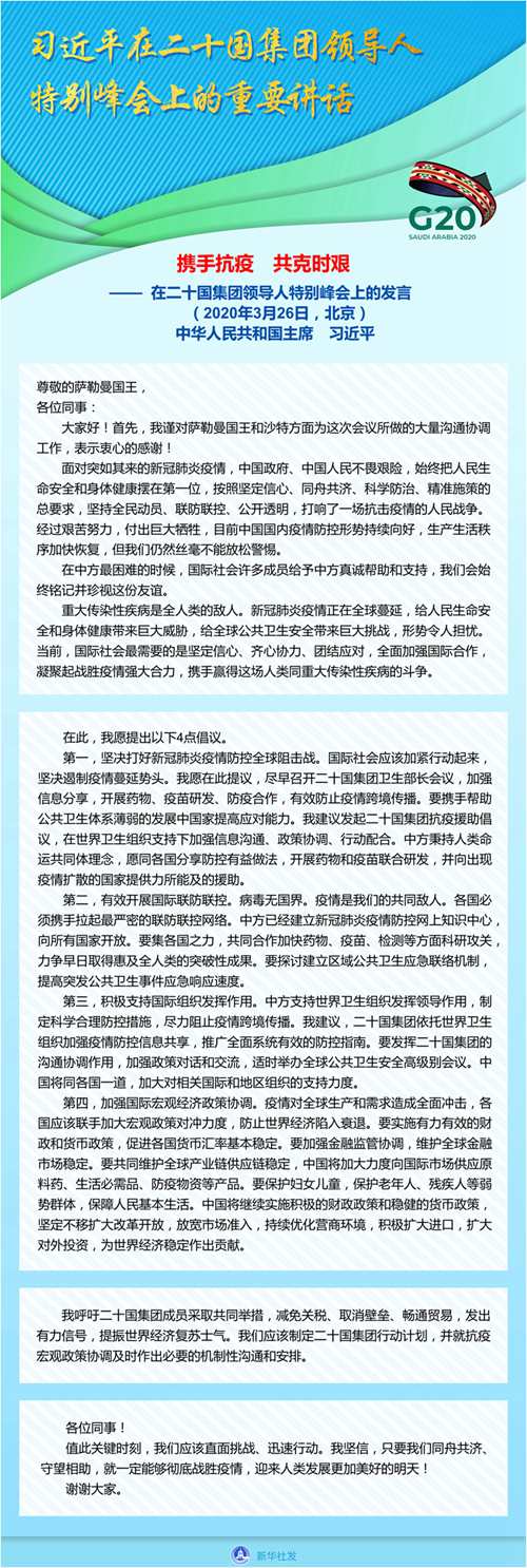 二十国集团领导人应对新冠肺炎特别峰会由沙特主办,以视频方式举行,旨在推动全球合作应对疫情、稳定世界经济。