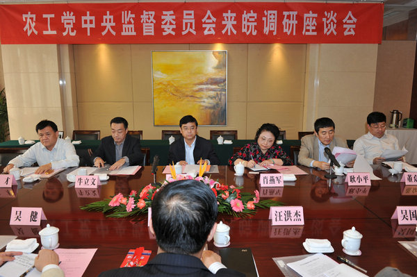 20日下午,调研组一行在合肥梅山饭店召开座谈会,农工党安徽省委主委牛立文,副主委耿小平、董众兵、方才,及部分农工党省委常委、部分担任政府实职的党员代表和农工党省委机关部室负责人参加了座谈会。与会人员就农工党安徽省委领导班子制度建设、作风建设、遵守党章和履行职责等情况,纷纷畅所欲言,并对党员干部工作提出了一些意见和建议。21日下午,调研组一行在农工党省委主委牛立文、副主委方才、组织部部长余成林的陪同下,赴滁州展开调研,并与农工党滁州支部领导班子成员以及部分党员代表座谈,听取意见和建议。调研组一行对农工党安徽省委在领导班子制度建设、作风建设以及遵守党章和履行职责等方面工作给予了充分肯定,对农工党安徽省委在组织建设上取得的成绩给予了高度评价。