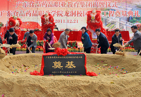 1221日上午,锣鼓声隆,彩旗飘飘,广东食品药品职业教育集团揭牌仪式暨广东食品药品职业学院龙洞校区扩建工程奠基典礼隆重举行。全国人大常委、广东省人大常委会副主任,农工党中央副主席、广东省委员会主委王宁生等领导,广东省各政府部门、行业协会、国内外及省市知名企业、高等院校的领导嘉宾和广东食品药品职业学院的师生近600人出席了典礼。