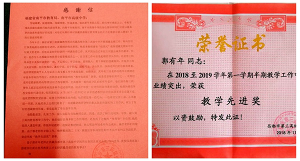 郭有年是本批福建省“组团式”教育援藏支教队中年级最大的教师,但在支教工作期间,他始终勤勤恳恳、无私奉献,展现了良好的师德师风,为当地教育工作做出不平凡的贡献,并获得西藏昌都市第三高级中学“教学先进奖”表彰。(农工党南平市委会)