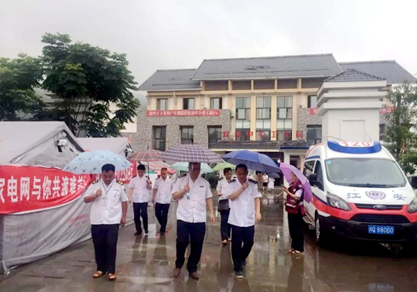 6月20日,杜宝佺(左三)带领四川省卫生和计划生育监督执法总队抗震救灾卫生监督小组在珙县实地查看防疫卫生监督情况并提出指导意见