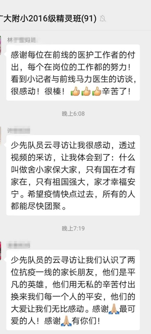 全校师生在观看了这次“云”队会后,都大受感动。他们看清了英雄的模样,也记住了英雄的担当。在班级微信群里,大家纷纷写下了感言。许多孩子表示,将来也要抗疫英雄们一样,学好知识,成为祖国的脊梁。