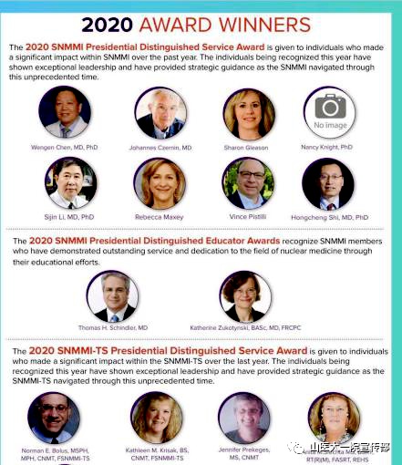 该奖项是由SNMMI主席提名并经会议讨论通过获得。2020年SNMMI主席特别贡献奖是颁发给在过去一年中对SNMMI产生重大影响者,尤其是在SNMMI经历史无前例的特殊时期中,今年的获奖者要具有非凡的领导力和卓越的建树,对业界的发展及重大决策等方面发挥了关键性的作用。