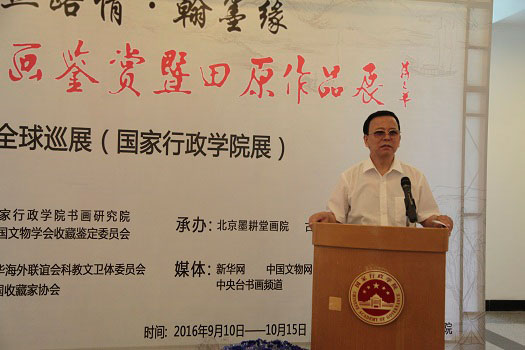 2016年9月10日上午10:00,“丝路情·翰墨缘——古今书画鉴赏暨田原作品展国家行政学院展”开幕式在国家行政学院隆重举行。此次展览由国家行政学院书画研究院,中国文物学会收藏鉴定委员会主办,北京墨耕堂画院承办。展览日期为9月10日至10月15日。
