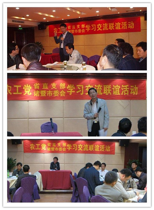 之后,在诸暨大酒店召开了省直基层组织与诸暨市委基层组织学习交流联谊会。省委会宣传部副部长、三个支部的联络员陈以主持会议。会上,省直浙江工商大学支部主委郑勇军、综合支部主委赵国宪、邵逸夫医院支部主委陈定伟,以及诸暨市委会办公室主任、人民医院支部主委徐栋鑫,诸暨市委会副主委宋益大等分别介绍了各自支部在参政议政、社会服务、组织活动等方面的经验。诸暨市委会副主委屠建中介绍了诸暨市农工党组织发展史与近年市委会的组织建设与思想建设工作情况。最后陈以副部长作总结性发言,他认为这次学习交流联谊活动是一次谋求互相交流、增进友谊、加强合作、共同发展、取得共赢的好机会,省直和诸暨市委会党组织工作各有所长、各有特色,今后应多联络、多沟通、多交流、多合作,进一步开展形式多样、内容多彩的组织活动。诸暨市委会顾问张金灿、市委会办公室副主任袁小平等也一同参加了会议。