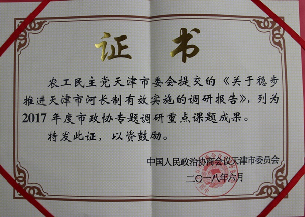 日前,天津市政协通报了2017年度优秀调研成果评选结果,农工党天津市委会提交的《关于稳步推进天津市河长制有效实施的调研报告》被列为2017年度市政协专题调研重点课题成果。