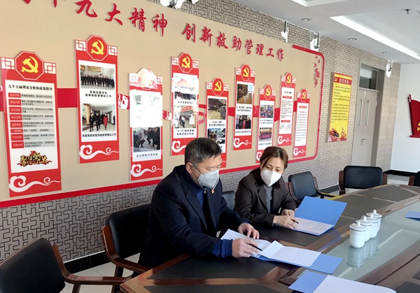梁丽君(右)正在与同事研究救助站工作