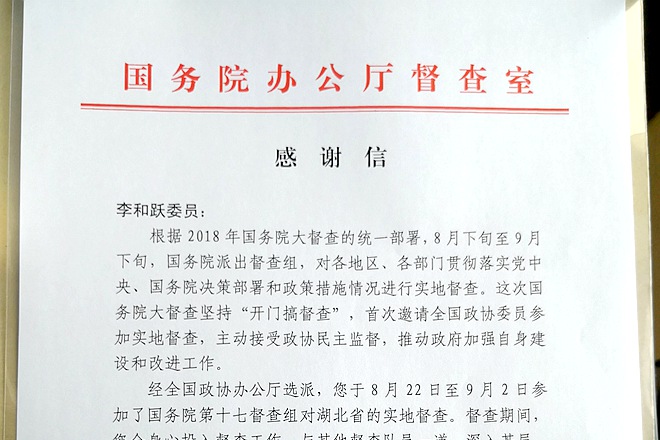 农工党吉林省委会副主委李和跃收到来自国务院办公厅督查室的感谢信