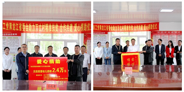 仪式上,农工党黑龙江省委会向万丈村贫困人口捐赠价值2.4万元的贝因美婴幼儿奶粉,哈尔滨香康医院向万丈村委会捐赠价值1.5万元的常用药品。万丈村委会向农工常黑龙江省委会和哈尔滨香康医院分别赠送了写有“爱心帮扶,情暖万丈”、“健康扶贫,关爱万丈”的锦旗。