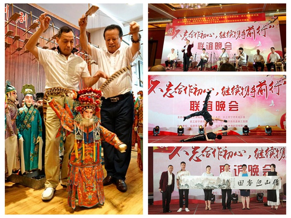8月11日晚,在福鼎市金九龙大酒店,四个支部党员联合福鼎市姚氏木偶剧团为福鼎人民奉献了题为“不忘合作初心·继续携手前进”的文艺演出。演出由农工党福建省文艺二支部主委张光仁策划并主持。晚会上,歌曲、京剧、杂技、提线木偶、舞蹈与书法表演等各项文艺节目精彩纷呈,丰富了当地群众的业余文化生活,获得了现场观众的一致好评。省委会组织部长林文、宣传部长田东代表省委会接受了党员书画家林伟现场挥毫泼墨创作的作品。通过载歌载舞的联欢,促进了党员间的交流,拉近了基层党员与省委会的感情,宣传了多党合作制度。