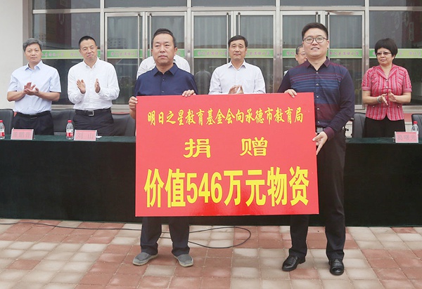 明日之星教育基金会向承德市教育局和隆化县教育局分别捐赠了576万元和72万元的教学物资,承德市教育局向明日之星基金会颁发荣誉证书。