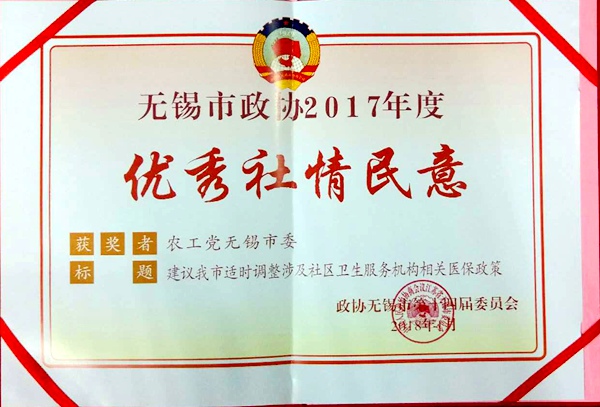 2017年12月29日,无锡市政协对年度社情民意信息工作进行了评比表彰,农工党无锡市委会报送的两篇信息获评“市政协优秀社情民意”:《关于调整涉及社区卫生服务机构医保政策的相关建议》(张亚菁)、《关于加强我市交通安全管理杜绝高架隧道安全隐患的建议》(钱娴)。